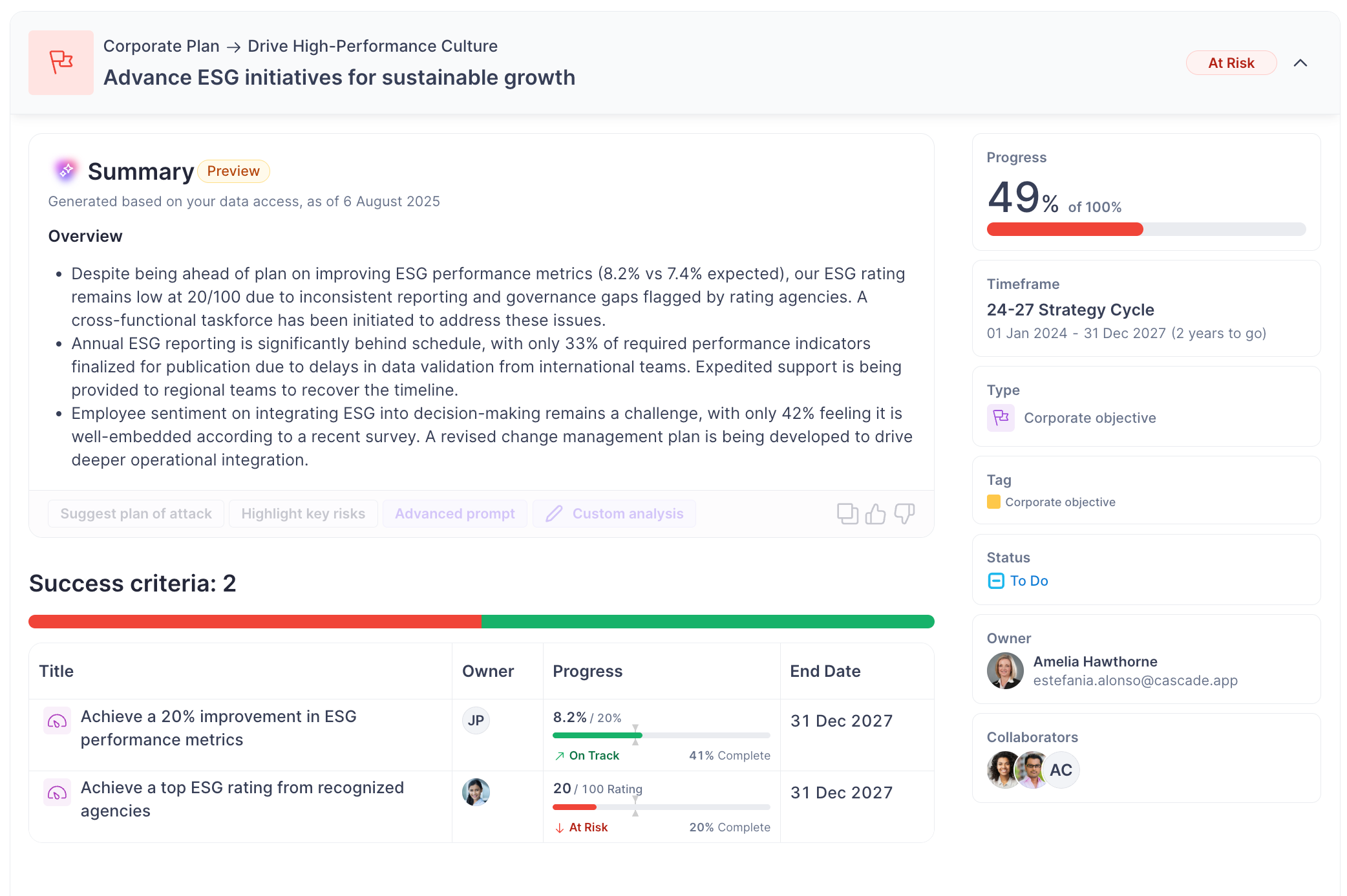 The summaries pull insights from goals, progress, metrics and contributing success criteria to help you roll up insights and get a broad view of what's happening under the surface.