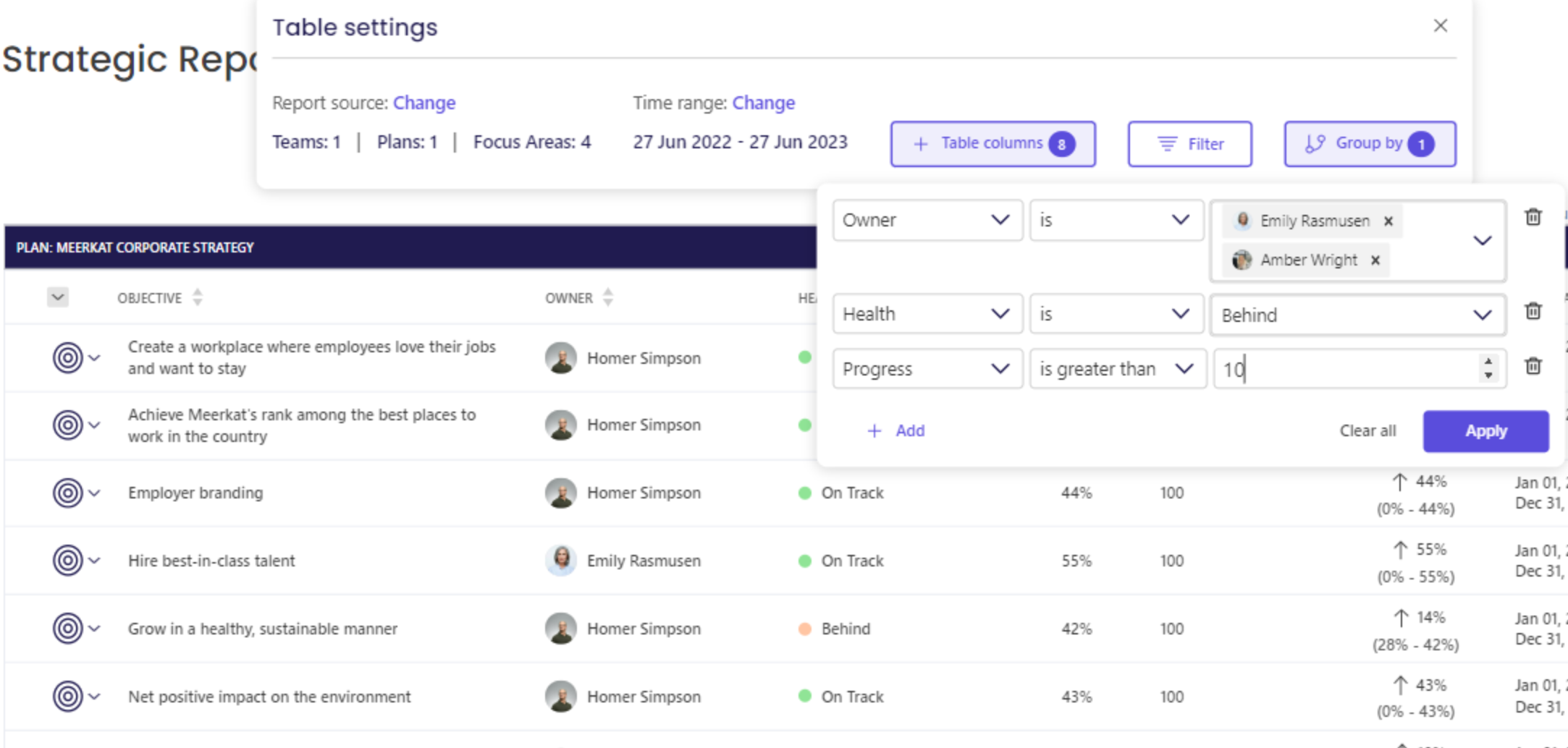 Now you can filter your objectives table in reports with the custom fields you’ve created.