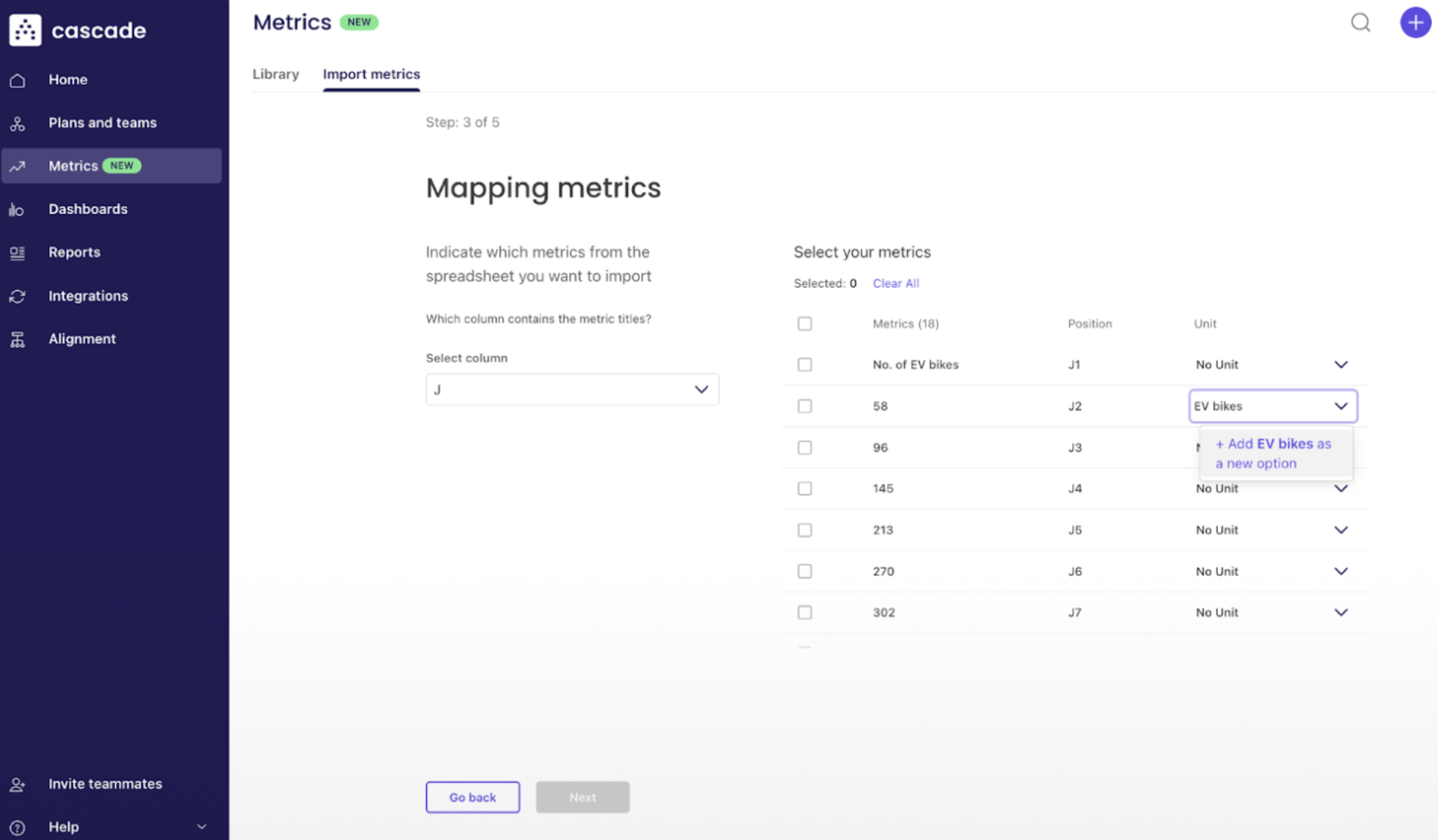 Make your Cascade more familiar for your organization with your lingo. Add custom units when you import your metrics from the Metrics Library.