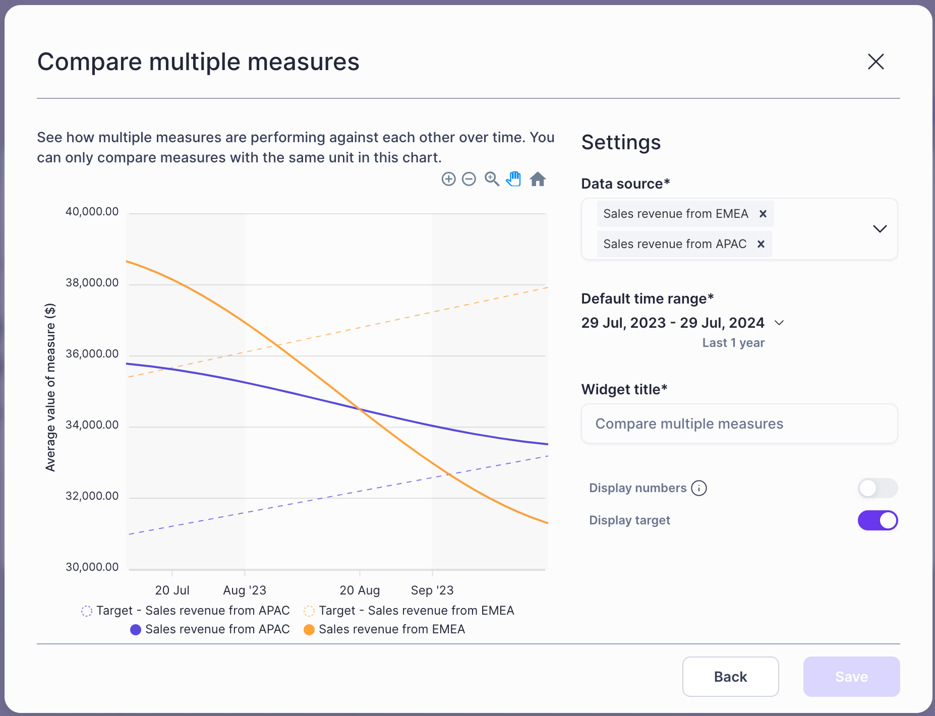 Available now in compare multiple measures widget on Report. You can select to display the target when you are creating the widget.