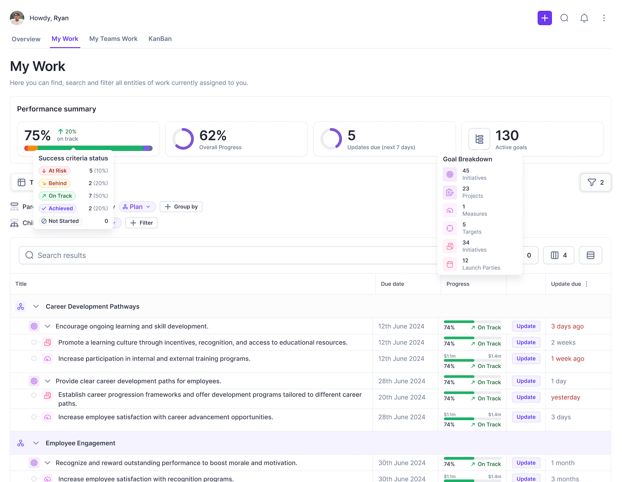 My Work provides a quick and easy overview of your current goals. It helps streamline how you manage and execute your work. Goals that you either own or contribute to are listed in this view.β