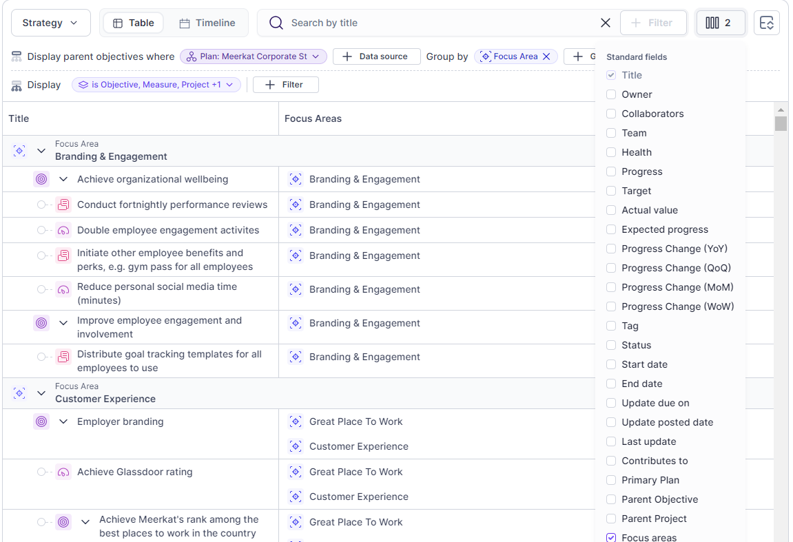 See the list of all Focus Areas your goals align up to as a column in Report tables.‍