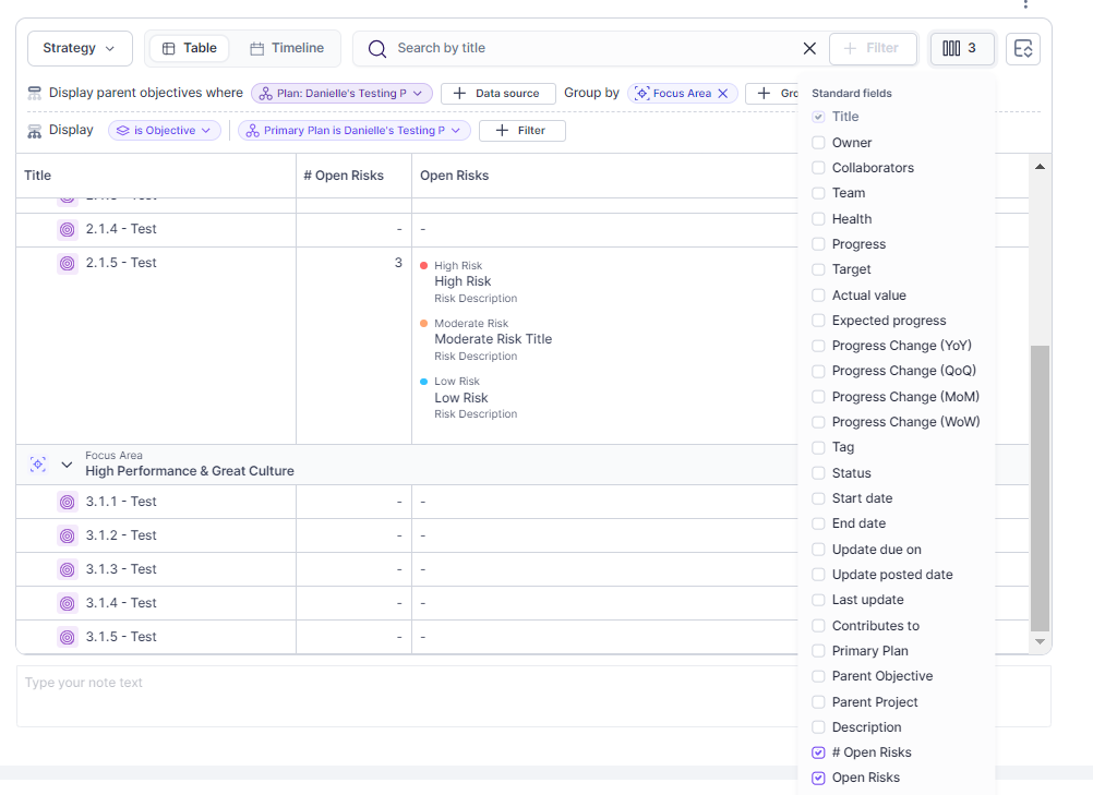 See details of your risks, including title, description, and severity, as well as the number of open risks for your goals in reports.