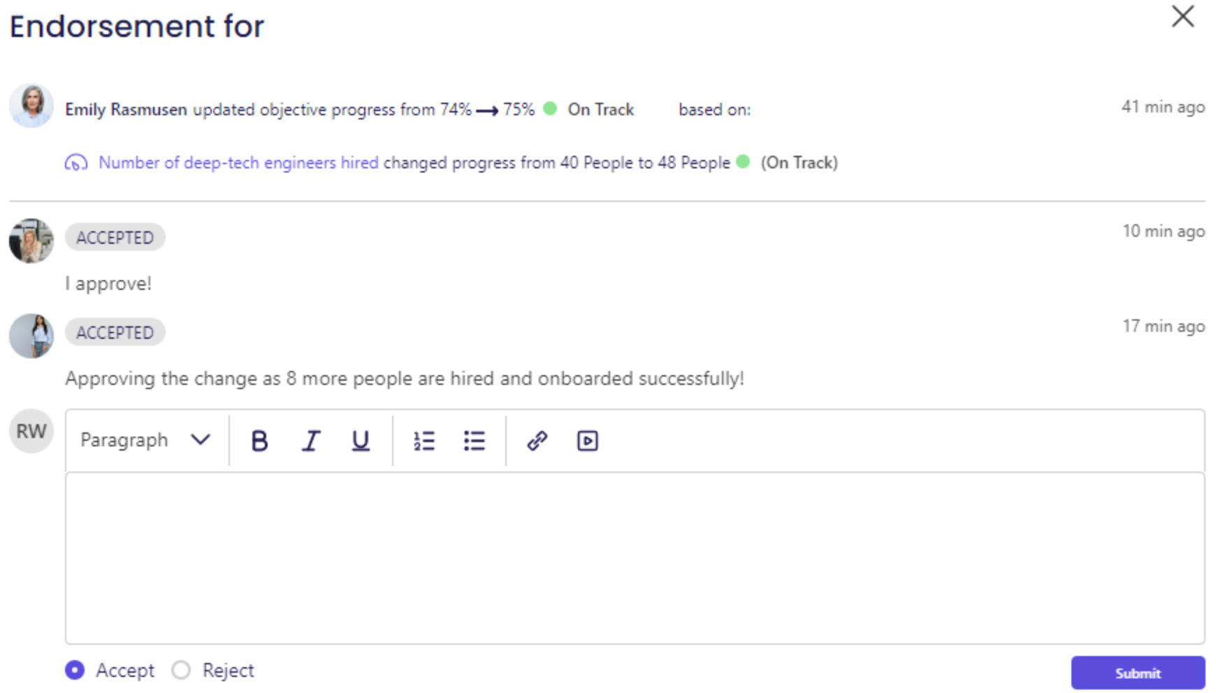 Endorsements allow you to add a gatekeeper to your strategic workflows. With endorsements, support your teams through next steps by accepting or acknowledging updates.