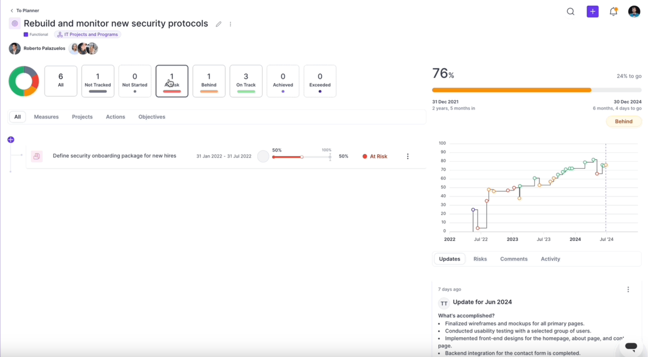 Stay on top of all updates, risks, and comments related to your goals in one consolidated view.