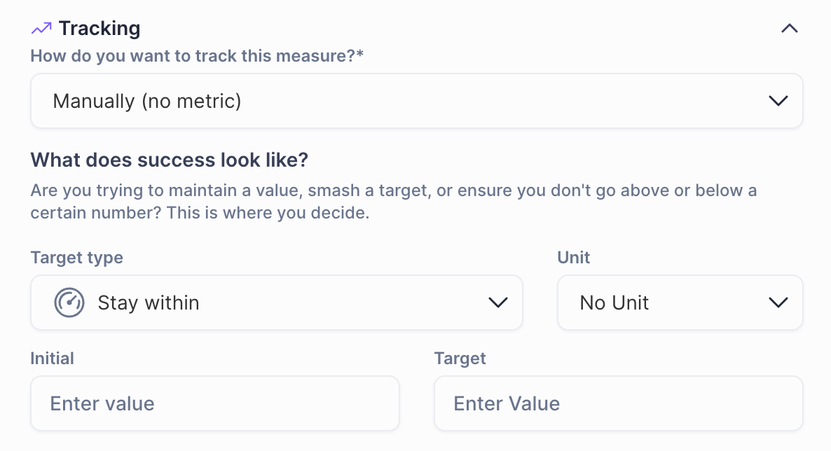 Stay within allows you to track a budget, where the goal is to stay below the budgeted target. Health scoring will accurately reflect On Track health for being below target and Behind and At Risk health when exceeding the target amount.